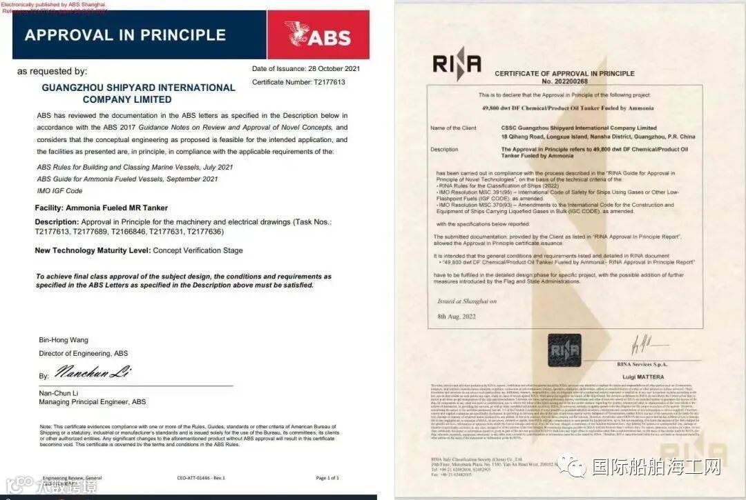 2022年8月,广船国际海科院自主研发设计的MR成品油船/化学品船氨燃料科研项目顺利获得ABS船级社原则性认可证书(AIP),9月又一举取得了RINA船级社的AIP证书,为绿色航运发展提供了中国解决方案。