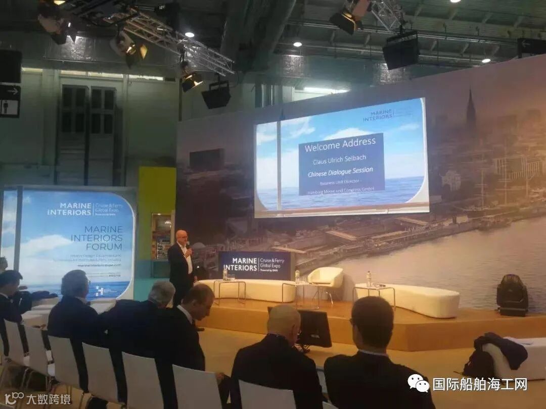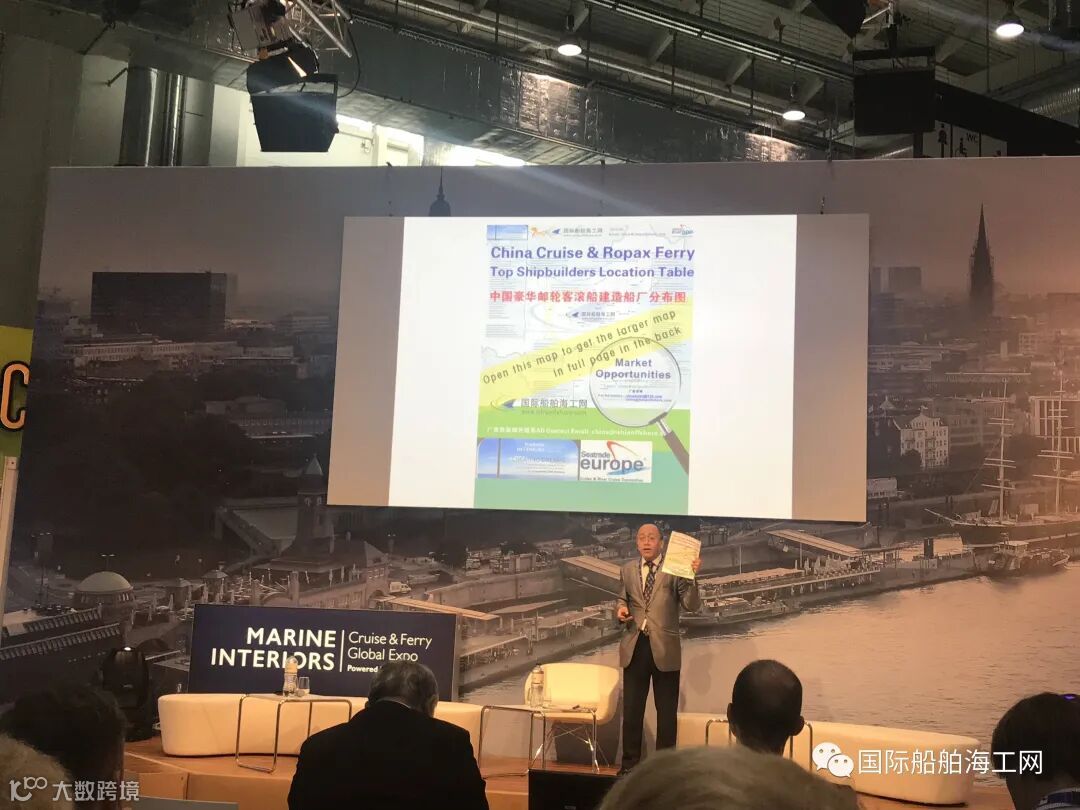 2019年在德国展览主办方支持下,总部上海的国际船舶海工网和德国汉堡驻中国联络处在欧洲最大邮轮和渡轮展会、德国汉堡SMM展览馆内同期开幕的欧洲邮轮展(Cruise & River Cruise Convention)和德国首届邮轮内饰内装展(www.marineinteriors-expo.com)的展会上,在2019年9月13日,在展览馆内的A3馆演讲厅,联合成功举办了免费的“中欧邮轮和客滚船渡轮产业交流会”。