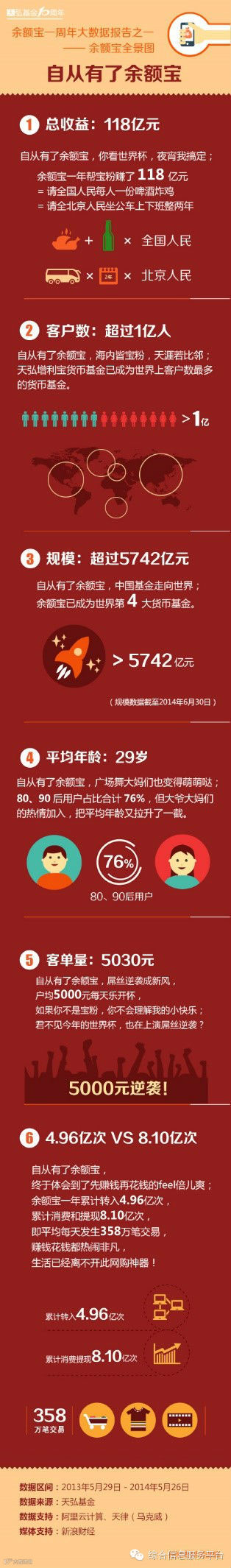 余额宝自去年6月13日上线,已成立一年有余。短短一年间,用户数过亿,一年为宝粉赚得118亿,规模达到5742亿,宝粉平均年龄只有29岁!更多精彩,请看下图。