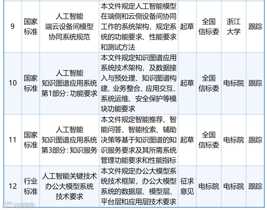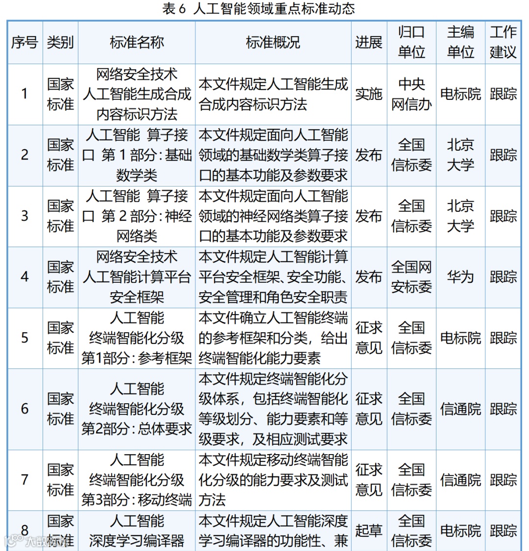 2025年8月,《人工智能 算子接口 第1部分:基础数学类》等3项国家标准正式发布。9月,《人工智能 深度学习编译器技术规范》等4项国家标准立项计划下达,国家标准《人工智能 终端智能化分级》系列和行业标准《人工智能关键技术 办公大模型系统技术要求》公开征求意见,国家标准《网络安全技术 人工智能生成合成内容标识方法》正式实施。具体情况见表6。