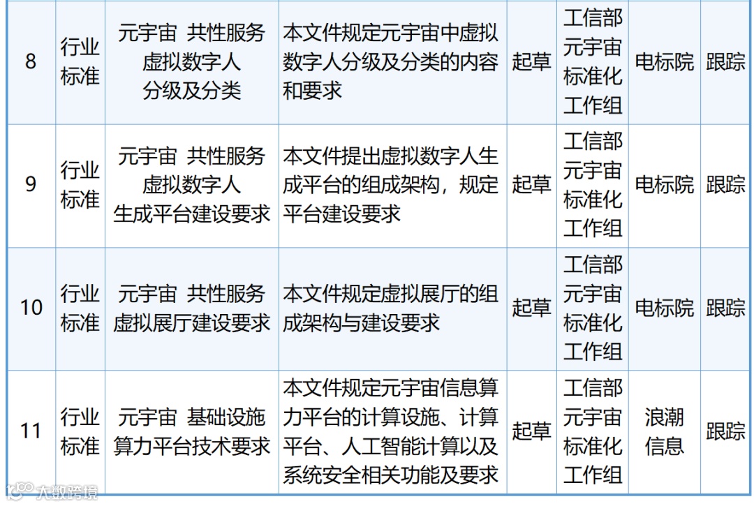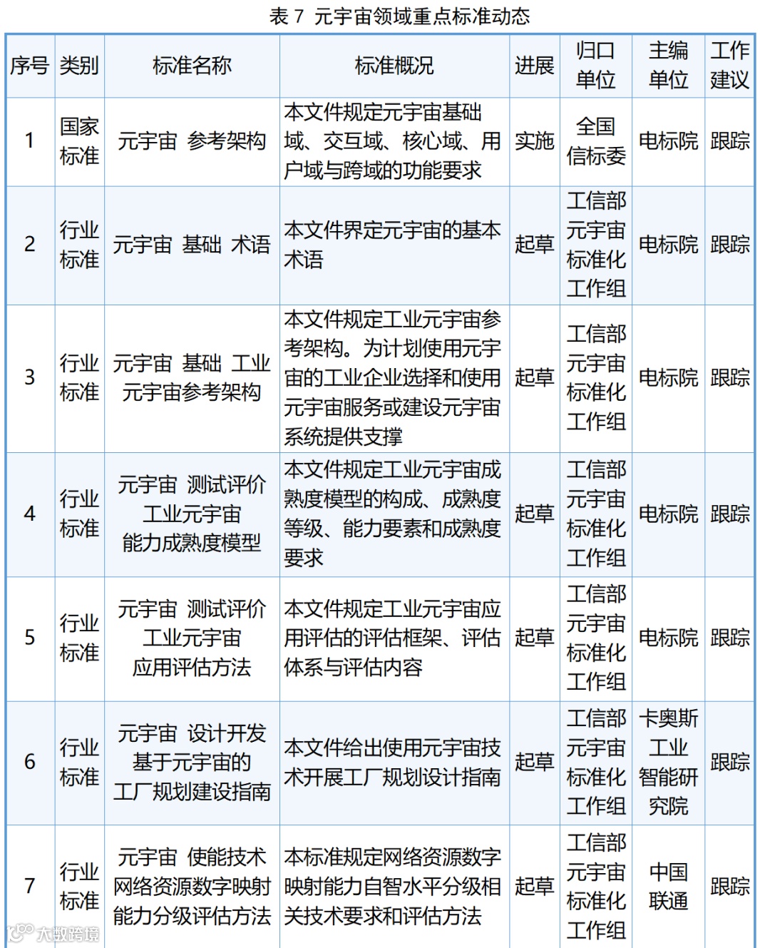 2025年7月,工信部编制完成2025年第三批行业标准制修订和外文版项目计划,首批10项元宇宙领域行业标准已批准立项。8月,我国首个元宇宙领域国家标准《元宇宙 参考架构》正式发布并实施。具体情况见表7。