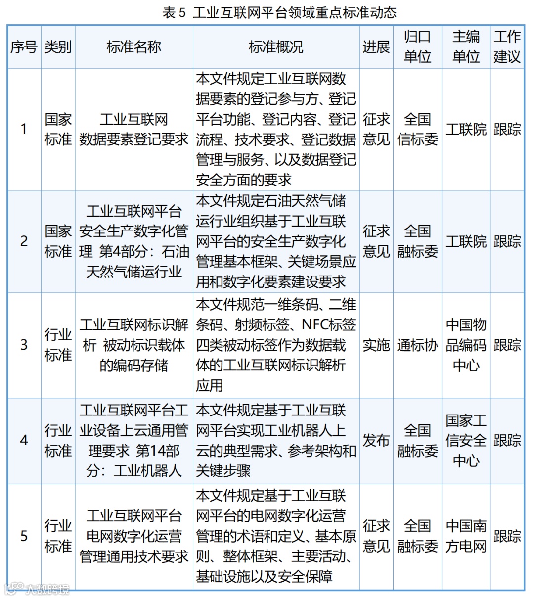 2025年7月,全国信标委组织国家标准《工业互联网数据要素登记要求》公开征求意见。8月,行业标准《工业互联网标识解析 被动标识载体的编码存储》正式实施。9月,全国融标委组织国家标准《工业互联网平台 安全生产数字化管理 第4部分:石油天然气储运行业》和行业标准《工业互联网平台 电网数字化运营管理通用技术要求》公开征求意见;行业标准《工业互联网平台工业设备上云通用管理要求第14部分:工业机器人》正式发布。具体情况见表5。