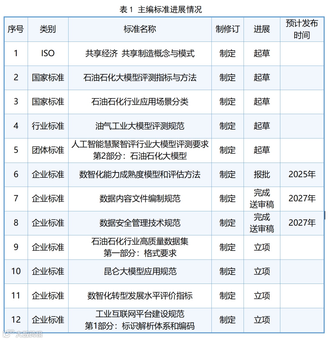 中国石油天然气集团有限公司信息技术专业标准化技术委员会人工智能标准工作组持续推进人工智能相关标准化工作。2025年8月,完成2026年集团公司人工智能相关企业标准申报预审工作。2025年9月,完成油气低空无人系统系列7项国家标准需求征集和研讨工作。
