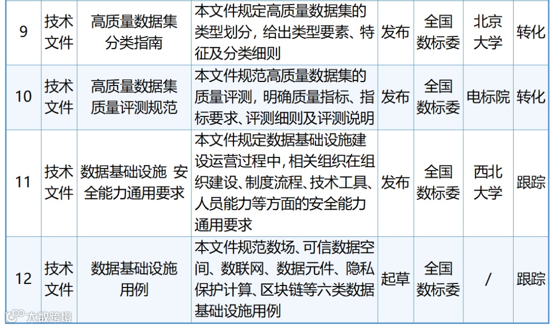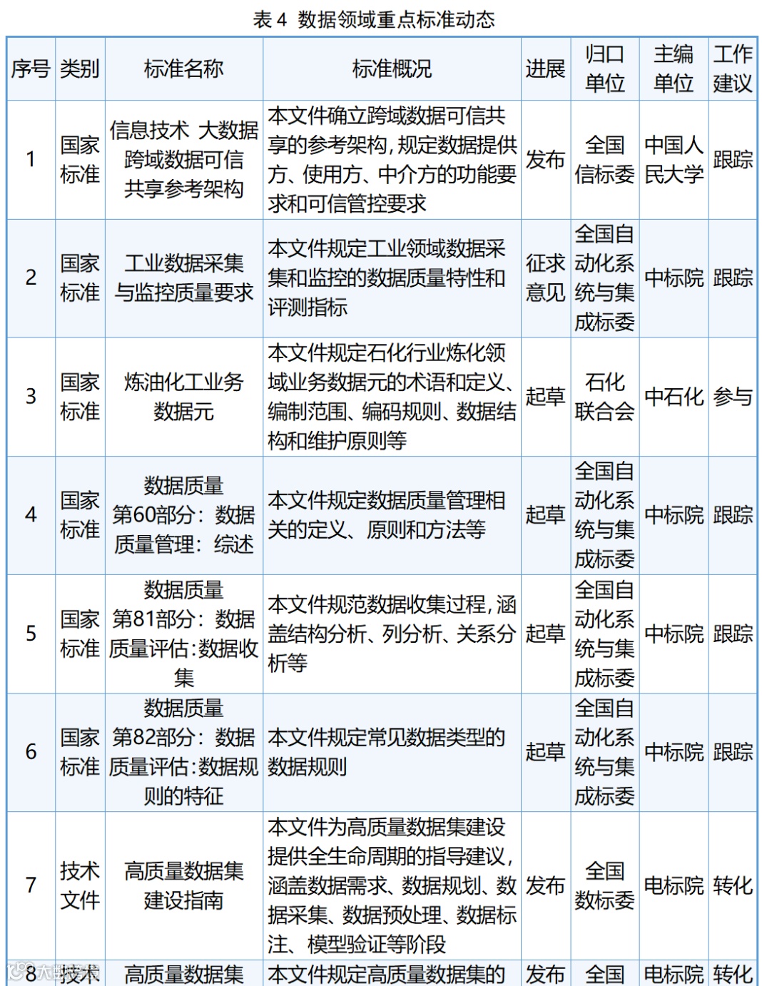 2025年7月,国家标准《工业数据采集与监控质量要求》公开征求意见,全国数标委组织召开技术文件《数据基础设施 用例》研讨会。8月,国家标准《信息技术 大数据 跨域数据可信共享参考架构》发布,《高质量数据集》系列及《数据基础设施 安全能力通用要求》等5项技术文件发布,《数据质量 第60部分:数据质量管理:综述》等3项国家标准计划下达。9月,国家标准计划《炼油化工业务数据元》下达。具体情况见表4。