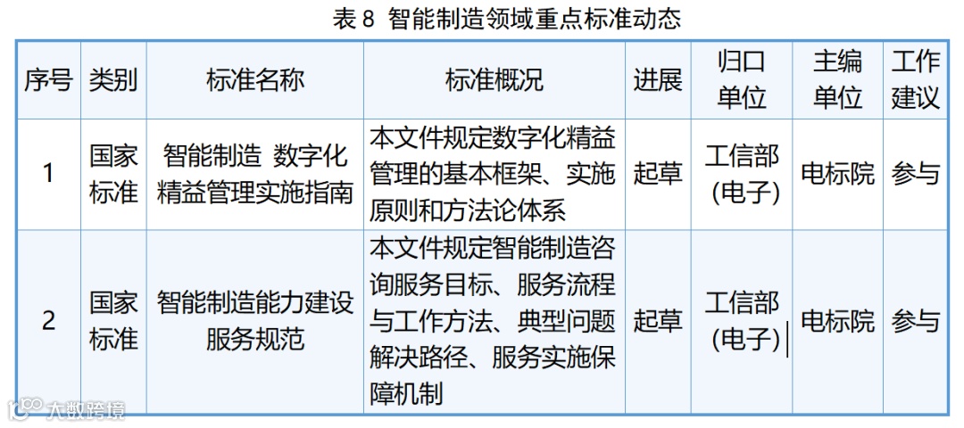 2025年8月,电标院组织召开国家标准《智能制造 数字化精益管理实施指南》启动会。9月,电标院组织召开国家标准《智能制造能力建设服务规范》编制启动会。具体情况见表8。