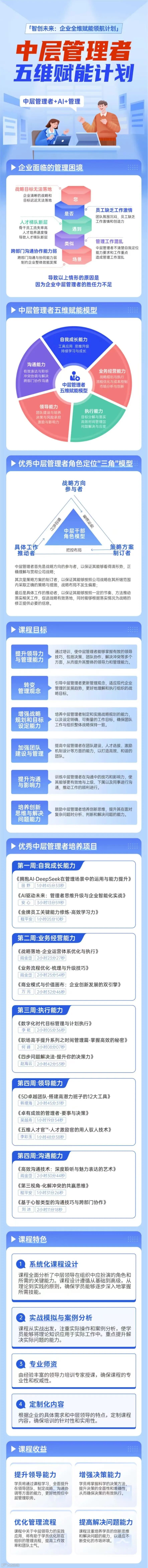 中层管理者五维赋能计划,围绕自我成长能力、业务经营能力、执行能力、领导能力、沟通能力,通过系统化训练与实战工具导入,助力中层管理者实现从“执行者”到“团队管理者”的角色跃迁,成为驱动企业高质量发展的核心动能。
