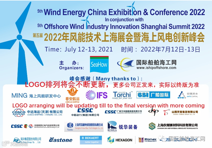 为交流中外风电产业的新机会和合作,2022年7月12日-13日将线上线下同时召开第五届“2022年风能技术上海国际大会”暨“2022年海上风电产业创新发展上海国际峰会”将举办,咨询:china@ishipoffshore.com 或 chinabobli@126.com