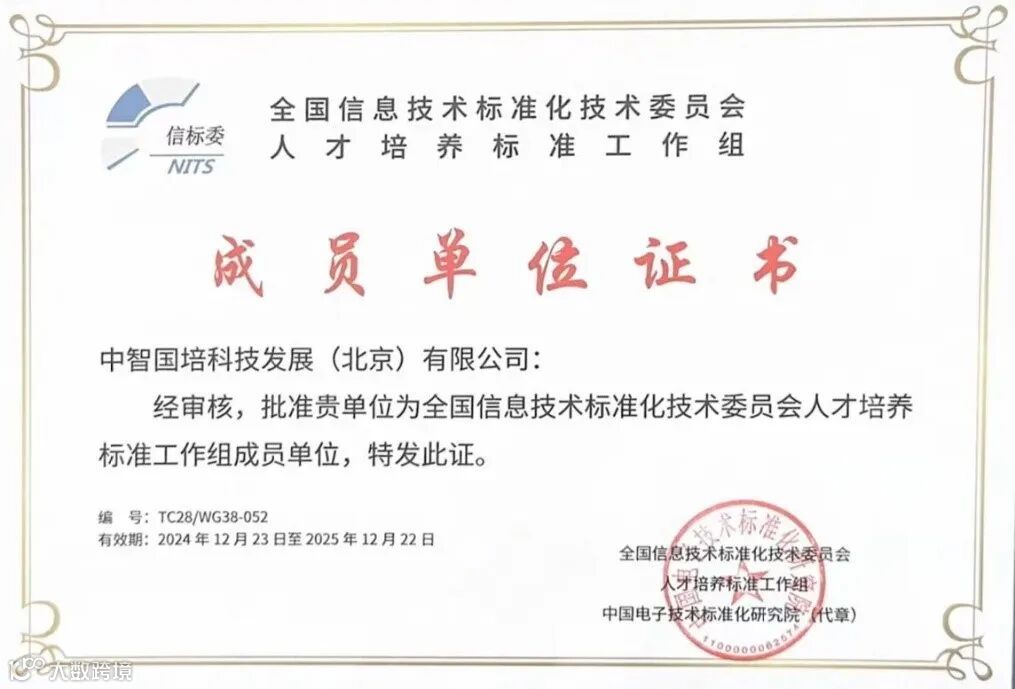 近日,中智国培科技发展(北京)有限公司(以下简称“中智国培”)经严格遴选,正式获批加入全国信息技术标准化技术委员会(简称“全国信标委”)人才培养标准工作组。这一成果标志着中智国培在信息技术人才培养领域的专业实践与创新成果,获得国家级标准化权威机构的高度认可,同时也彰显了中央企业在推进国家数字化战略进程中的责任担当与引领效能。
