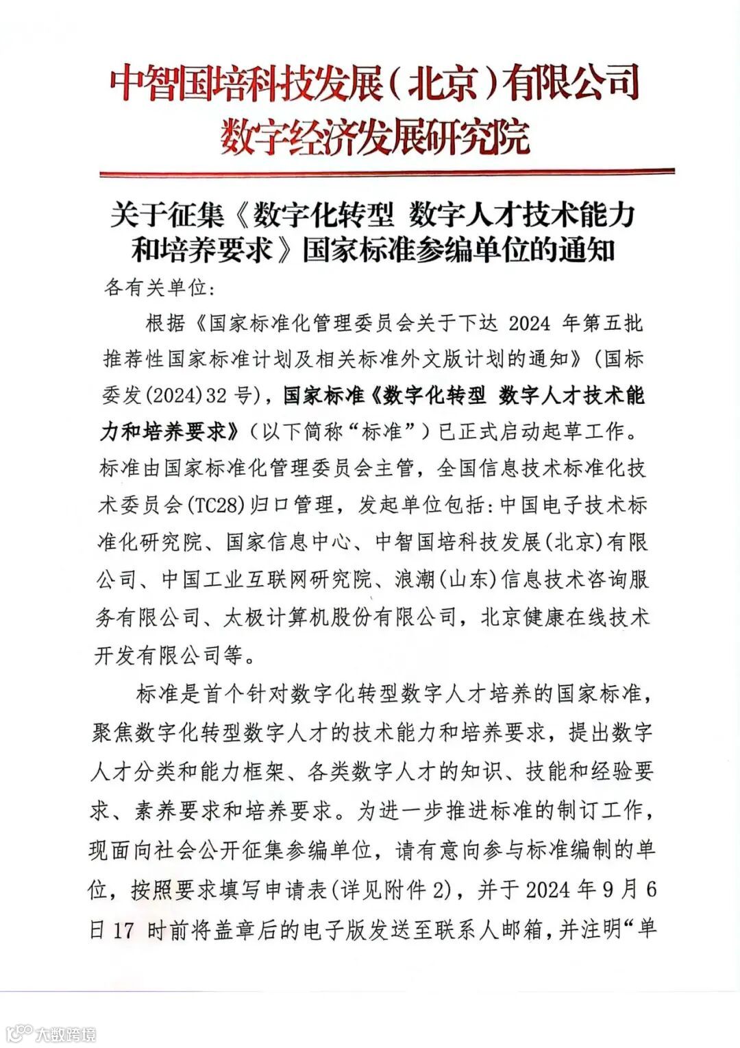 根据《国家标准化管理委员会关于下达2024年第五批推荐性国家标准计划及相关标准外文版计划的通知》(国标委发(2024)32号),国家标准《数字化转型 数字人才技术能力和培养要求》(以下简称“标准”)已正式启动起草工作。标准由国家标准化管理委员会主管,全国信息技术标准化技术委员会(TC28)归口管理,发起单位包括:中国电子技术标准化研究院、国家信息中心、中智国培科技发展(北京)有限公司、中国工业互联网研究院、浪潮(山东)信息技术咨询服务有限公司、太极计算机股份有限公司,北京健康在线技术开发有限公司等。
