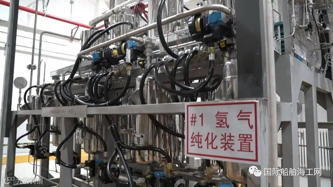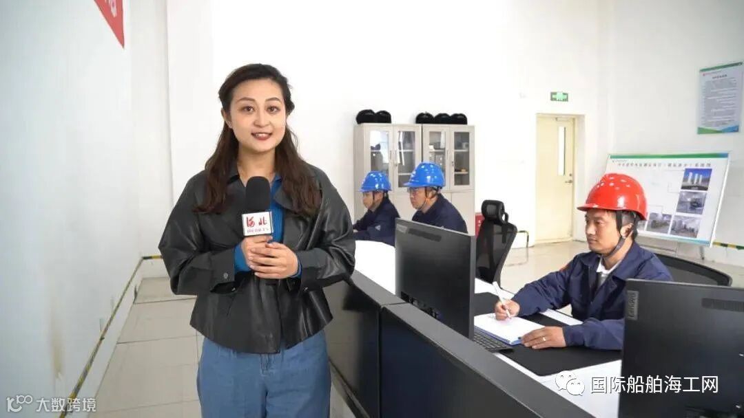 这里是河北建投风电制氢项目的车间,在我身旁的这个大型的圆柱体的东西叫做电解槽,通过项目配建的光伏、风机发出的电输入到电解槽内,水被电解为氧气和氢气,再经过纯化设备吸附杂质、分离氧气,就得到了纯度为99.999%的氢气。