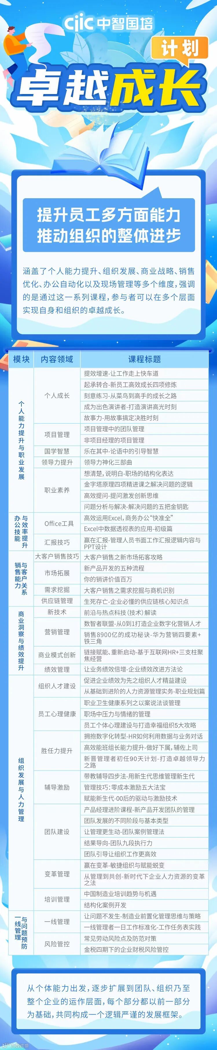 在当今快速变化的市场环境中,个人与组织的持续成长和发展变得尤为重要。为了应对日益复杂的商业挑战,提升员工的多方面能力,并推动组织的整体进步,中智国培特别设计“卓越成长计划”培训项目。