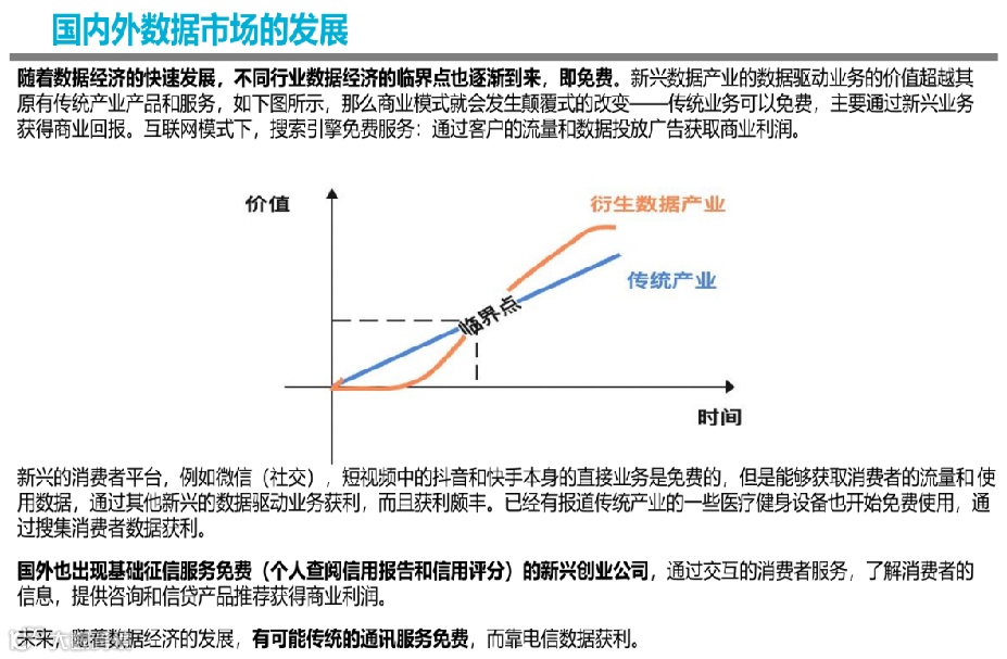 随着数据经济的快速发展,不同行业数据经济的临界点也逐渐到来,即免费。新兴数据产业的数据驱动业务的价值超越其原有传统产业产品和服务,如下图所示,那么商业模式就会发生颠覆式的改变——传统业务可以免费,主要通过新兴业务获得商业回报。互联网模式下,搜索引擎免费服务:通过客户的流量和数据投放广告获取商业利润。