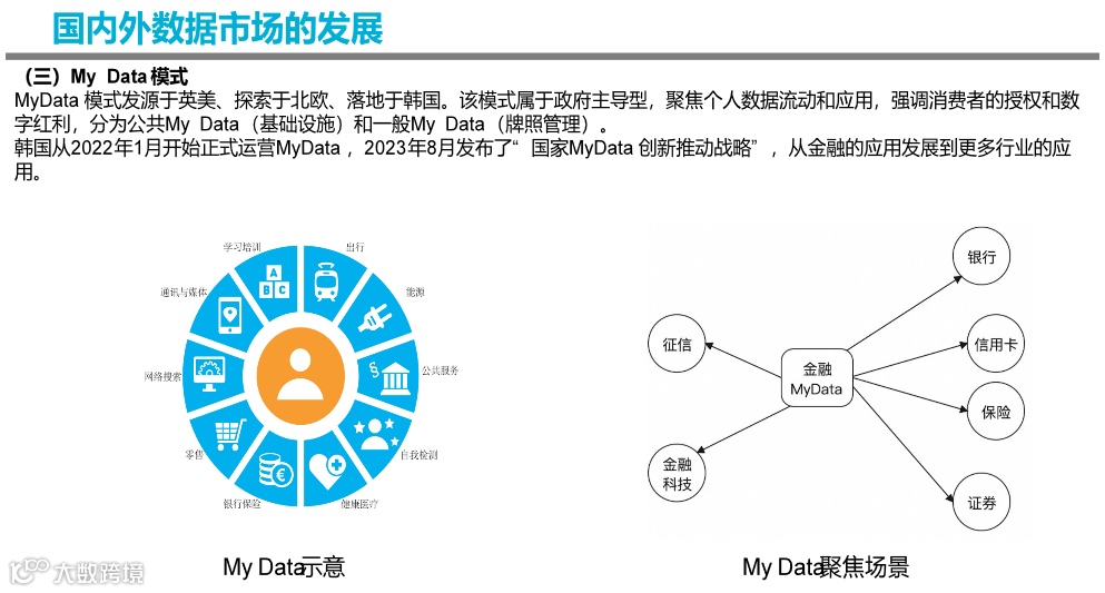 My Data 模式发源于英美、探索于北欧、落地于韩国。该模式属于政府主导型,聚焦个人数据流动和应用,强调消费者的授权和数字红利,分为公共My Data(基础设施)和一般 My Data(牌照管理)。