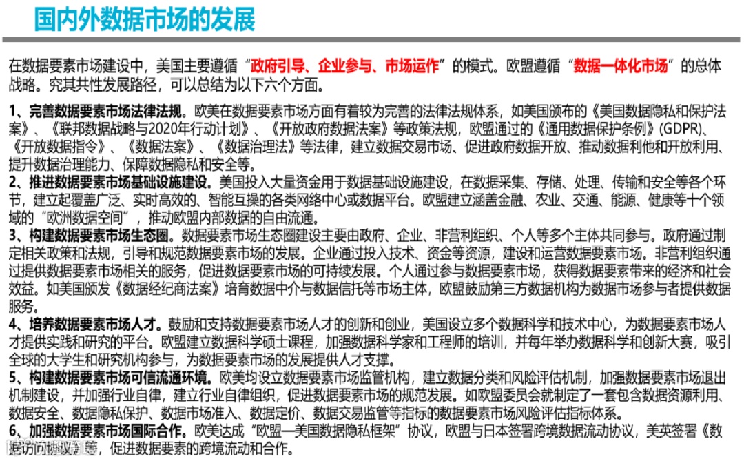 欧美在数据要素市场方面有着较为完善的法律法规体系,如美国颁布的《美国数据隐私和保护法案》、《联邦数据战略与2020年行动计划》、《开放政府数据法案》等政策法规,欧盟通过的《通用数据保护条例》(GDPR)、《开放数据指令》、《数据法案》、《数据治理法》等法律,建立数据交易市场、促进政府数据开放、推动数据利他和开放利用、提升数据治理能力、保障数据隐私和安全等。