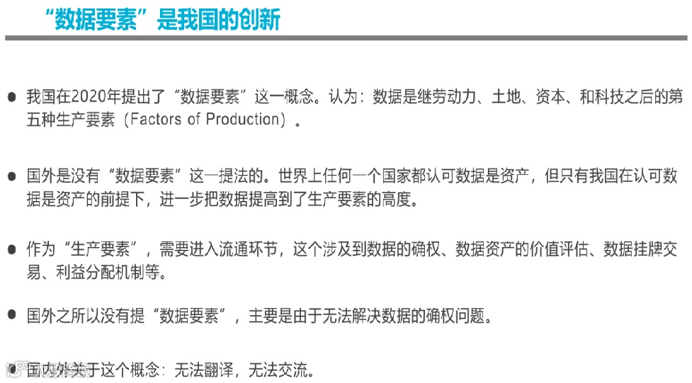 我国在2020年提出了“数据要素”这一概念。认为:数据是继劳动力、土地、资本、和科技之后的第五种生产要素(Factors of Production)。国外是没有“数据要素”这一提法的,世界上任何一个国家都认可数据是资产,但只有我国在认可数据是资产的前提下,进一步把数据提高到了生产要素的高度。作为“生产要素”,需要进入流通环节,这个涉及到数据的确权、数据资产的价值评估、数据挂牌交易、利益分配机制等,国外之所以没有提“数据要素”,主要是由于无法解决数据的确权问题,而我国不仅在此基础上提出了“数字底座”,也 实现了“数据资产入表”。