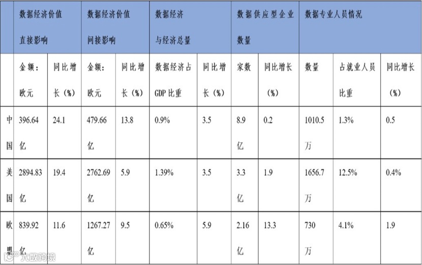 美国和欧盟的数据经济绝对规模较为引人注目,美国拥有最大的数据市场规模,欧盟次之。但中国在数据经济价值增长上位列第一,且中国拥有最多的数据供应型企业,较具发展潜力和发展前景。