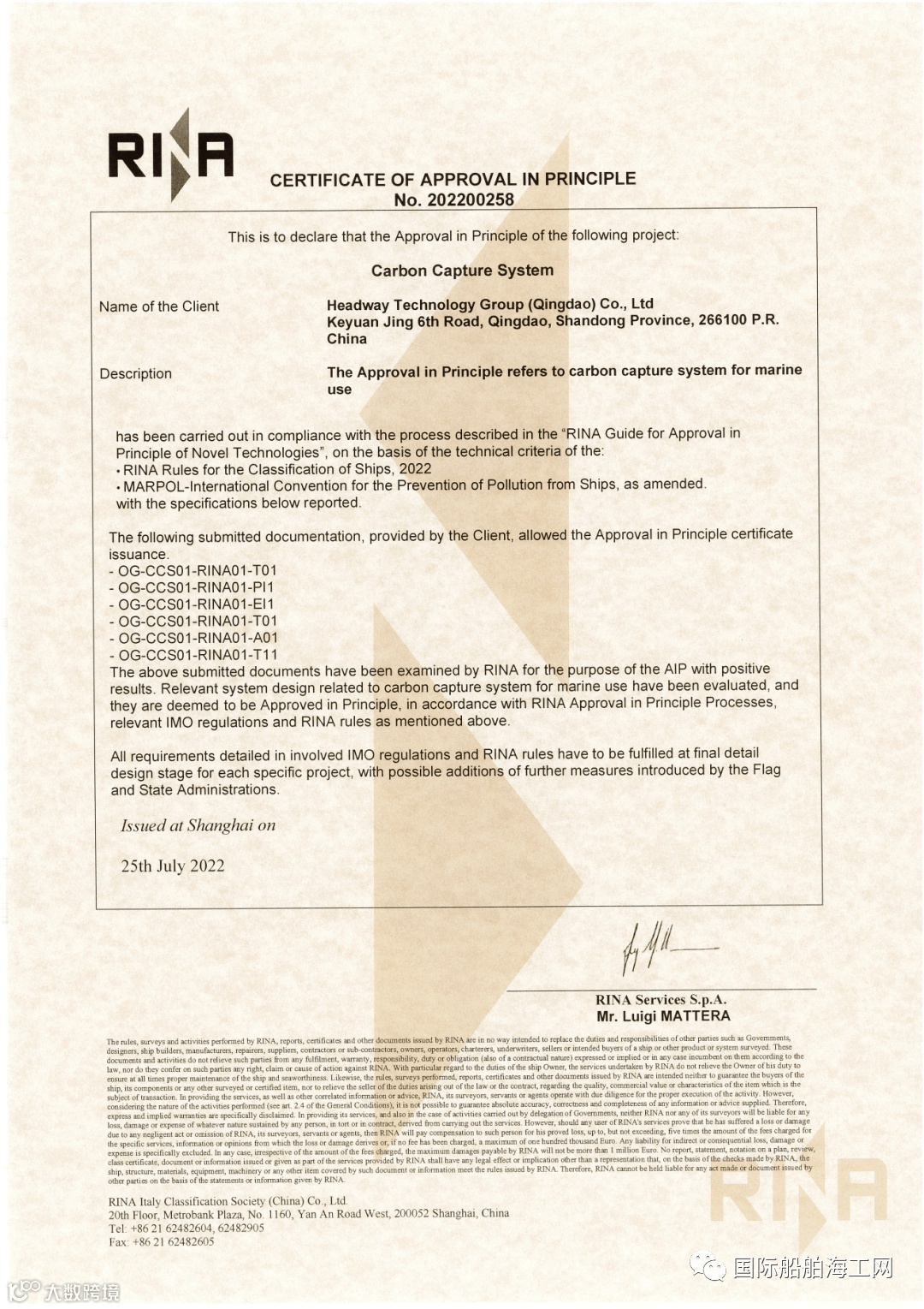 日前,由海德威科技集团(青岛)有限公司自主研发的海洋卫士®船舶二氧化碳碳捕集与储存系统(CCSU),正式取得由RINA船级社授予的原理认可证书(AIP),成为国内首家取得该证书的CCSU厂商。该系统具有脱碳效率高、体积小、能耗低、储运便捷等诸多优势,能够为船舶应对CO2减排提供节能、高效的解决方案。