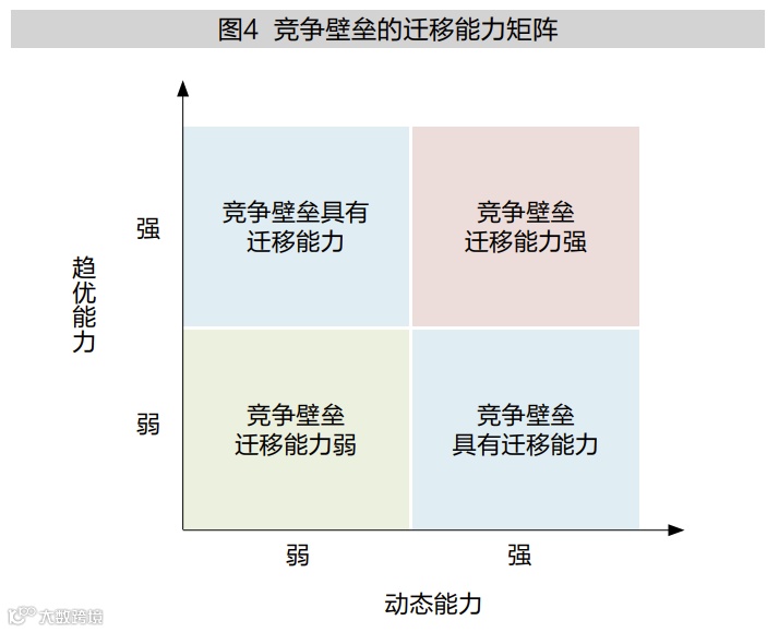 “壁垒迁移”这个问题尤其关键,它涉及到竞争壁垒灵活性的问题,缺乏灵活性或可迁移的壁垒就像二战法军的马奇诺防线一样,一旦进攻者绕行到后方,这个壁垒土崩瓦解。所以,竞争壁垒的构建与优化是一个持续性的长期过程,具象化的某一壁垒多会随着情景假定的变迁而失效,形成动态的、能有效迁移的壁垒才能在长期的商业周期中持续立于不败之地。实现壁垒动态迁移的关键在于在位企业能否形成趋优能力和动态能力。