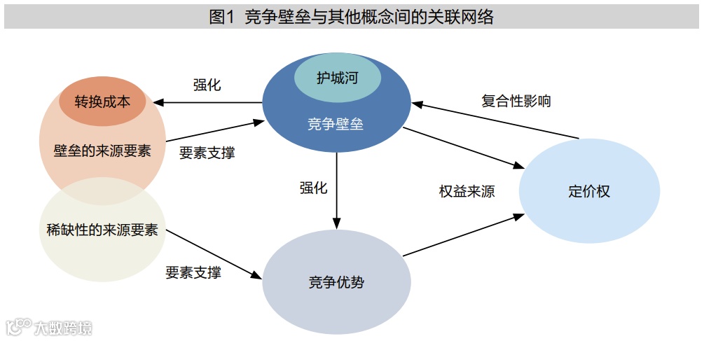 壁垒的概念最早源于军事领域。《说文解字》称“壁,垣也”“垒,军壁也”,壁垒即为用于对外御敌之墙垣。《六韬·王翼》所述,“修沟壍,治壁垒,以备守御”,壁垒也被视作竞争活动的重要组成要素,商业领域的壁垒一般指竞争壁垒。贝恩(Bain,1956)率先从经济学视角出发将壁垒概念引入商业领域,将竞争壁垒定义为“某一产业中的在位者相对于潜在进入者所具有的优势,这些优势反映在在位者能够把价格提高到竞争性价格水平之上,而又不会招致新厂商的进入”,并指出在位厂商所拥有的绝对成本优势、差异化产品、规模经济效应是其竞争壁垒的重要来源要素。斯蒂格勒(Stigler,1968)将竞争壁垒定义为一种谋求进入市场的新企业必须承担而在位企业无需承担的生产经营成本。