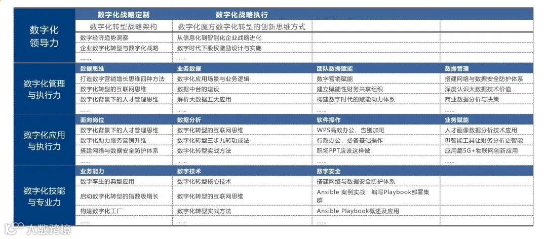 数字素养是数字人才培养的核心要求,也是企业人力资本数字化价值最大化的必要条件。如何培养具有业务能力和数字化专业能力的复合人才,是数字化转型取得成功的重要条件,尤其是具备战略眼光、数字思维、数字基础能力以及创新精神的人才梯队。所以,企业的数字化转型,关键是人的转型,是团队的转型,是企业组织文化和组织结构的转型。企业转型就必须要拥有相应的、匹配的、足够的数字化人才相支撑。