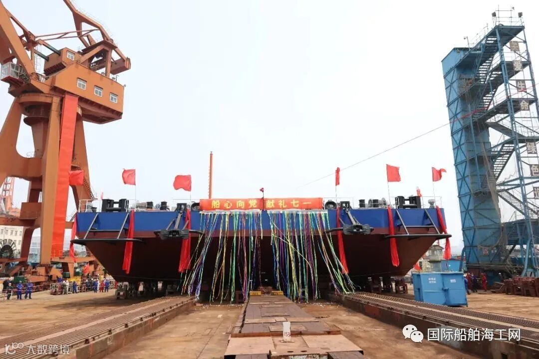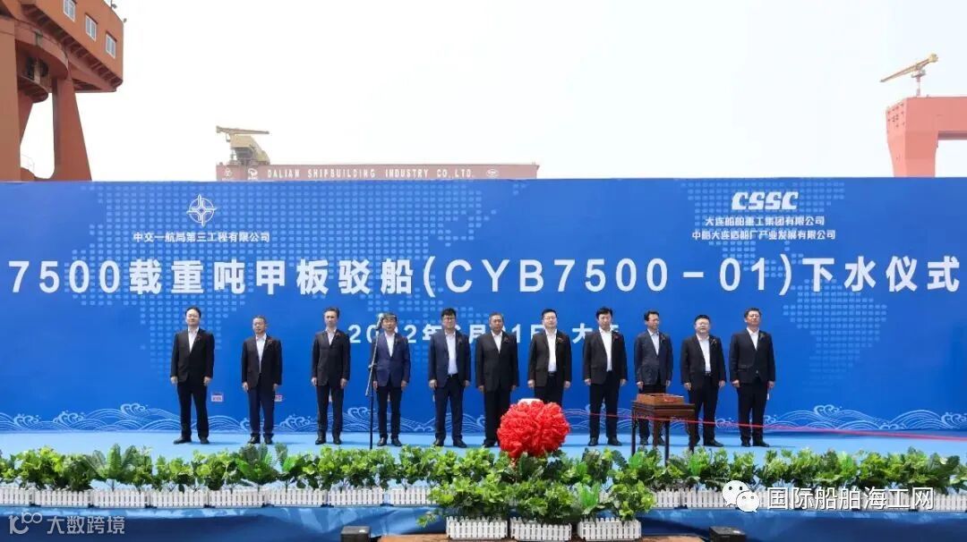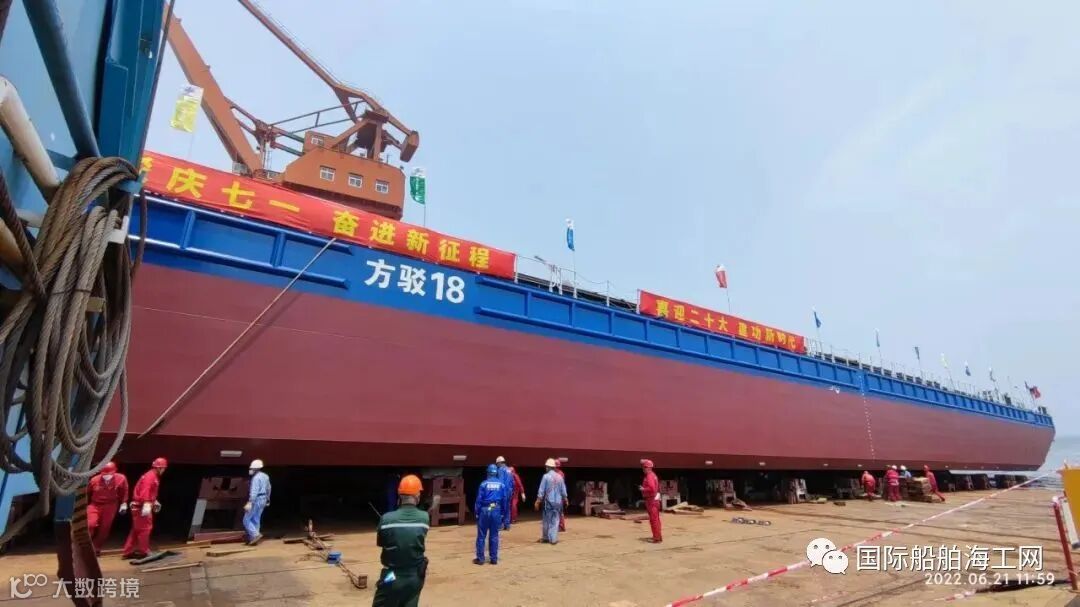 6月21日,一航局公司新购置的甲板驳船在大船集团2-1船台下水,大连大船集团副总经理丁一,大船产业党委书记、董事长王常涛,中国船级社大连分社副总经理岳孟强,公司领导王际好、耿一智、王世臣、董鹏飞、杨润来参加下水仪式。