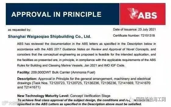 2021年8月,外高桥造船最新研发的氨燃料动力21万吨散货船获得ABS船级社颁发的原则性认可证书(AIP)