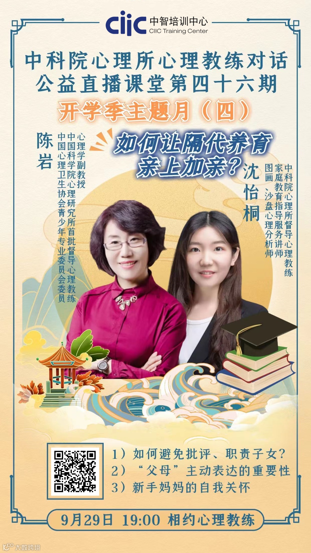,中国科学院心理研究所首批督导心理教练、心理学副教授陈岩老师,中科院心理所督导心理教练沈怡桐老师,为您现场分享开讲!