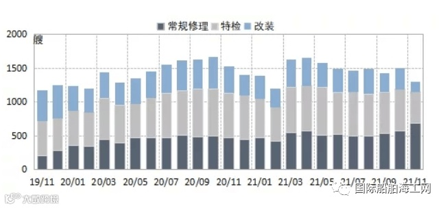 A :国际修船市场整体较为平稳。随着全球疫情得到一定程度的控制,航运市场一路高歌,全球修船市场整体延续平稳态势。根据克拉克森数据,1-11月,全球共修理16333艘,同比增加1.4%。常规修理和特检坞修时间较短,对船东排期影响较小,订单量均有所增长,常规修理和特检订单分别为5714艘和6831艘,同比分别增长15.4%和1.5%。航运市场火爆,船队运力紧张,运价持续高位,船东主动改装意愿不强,加上脱硫塔订单量锐减等因素,改装订单有所减少,共改装3788艘,同比减少14.5%。压载水处理系统改装量保持稳定,共加装3379艘,占改装总量的89.2%,同比增加4.7%。脱硫塔加装热潮明显消退,仅加装237艘,占改装总量的6.3%,同比大幅下降76.6%。