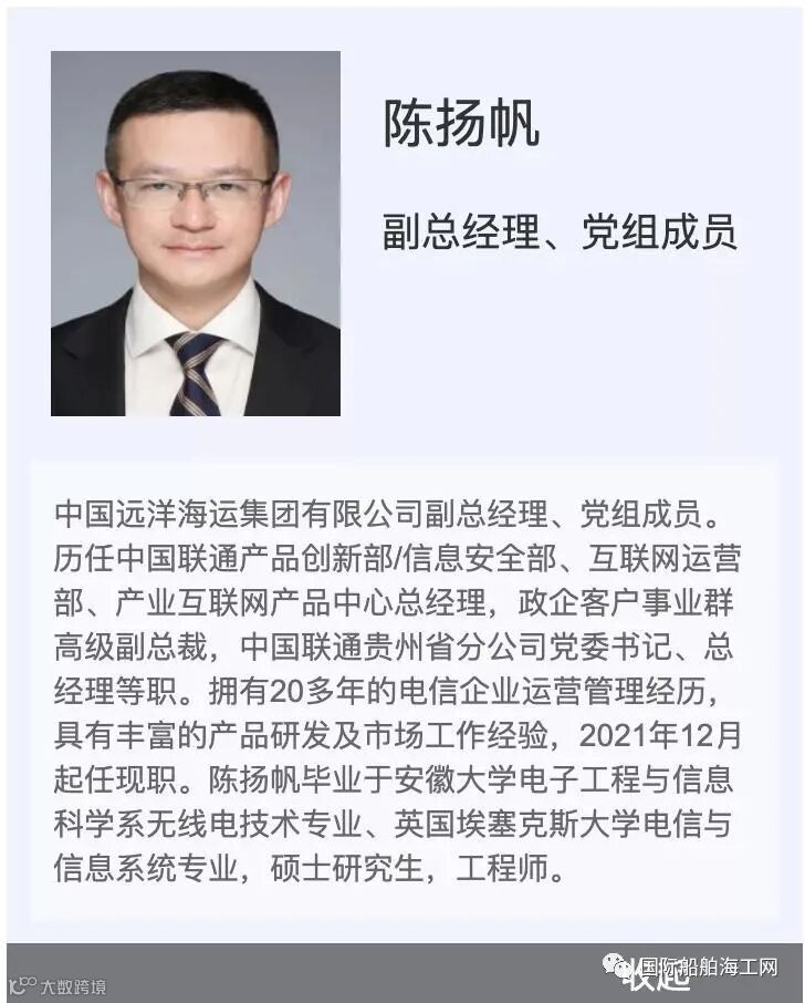 可以说互联网出身的他,对于产品创新、互联网运营非常熟悉,业界推测,陈扬帆的加入,将给中远海运插上数字化的翅膀,未来在海运端的互联网5G应用、智慧交通、智能制造等多个领域贡献数字智慧。