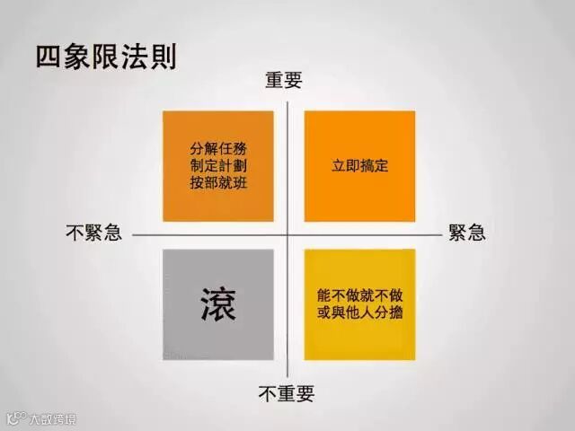 时间“四象限”法是美国的管理学家科维提出的时间管理理论,把工作按照重要和紧急两个程度进行了划分,基本上可以分为四个“象限”(见下图)。