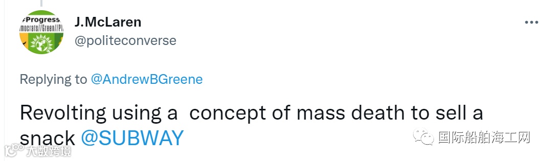 有人指责赛百味说:“反感用大规模死亡的概念来推销食物”。↓