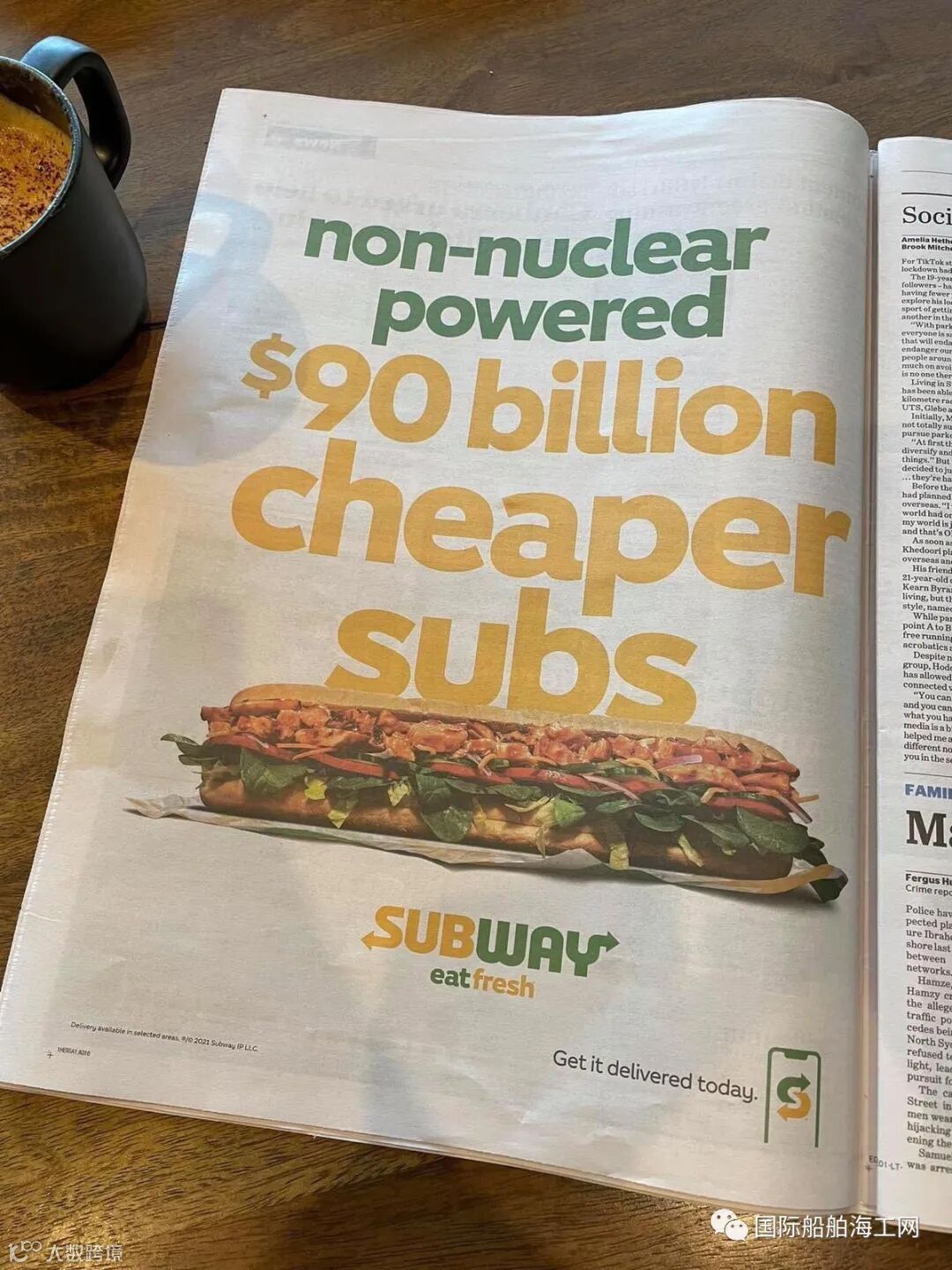 “今日俄罗斯”(RT)消息称,美国汉堡连锁店赛百味当地时间18日在澳大利亚《时代报》刊登了整版广告,吹嘘自己拥有“非核动力、便宜900亿澳元的潜艇”汉堡。报道称,这是对澳大利亚与法国签署的造船大合同常规潜艇订单交易成本膨胀的讽刺,后来澳大利亚反悔,撕毁了与法国的900亿澳元潜艇合同,转而从美国购买近600亿美元的核动力潜艇造船建造。