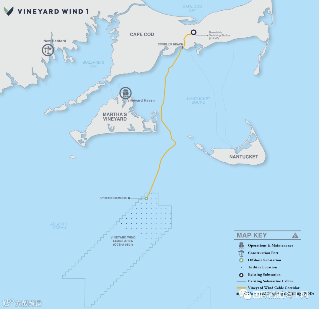 Vineyard Wind 1海上风场位于马萨诸塞州海岸15英里外,预计2023年投产,将采用62台13MW的GE Haliade-X海上风电机组,该风机叶轮直径220米,叶片长107米,高度248米。
