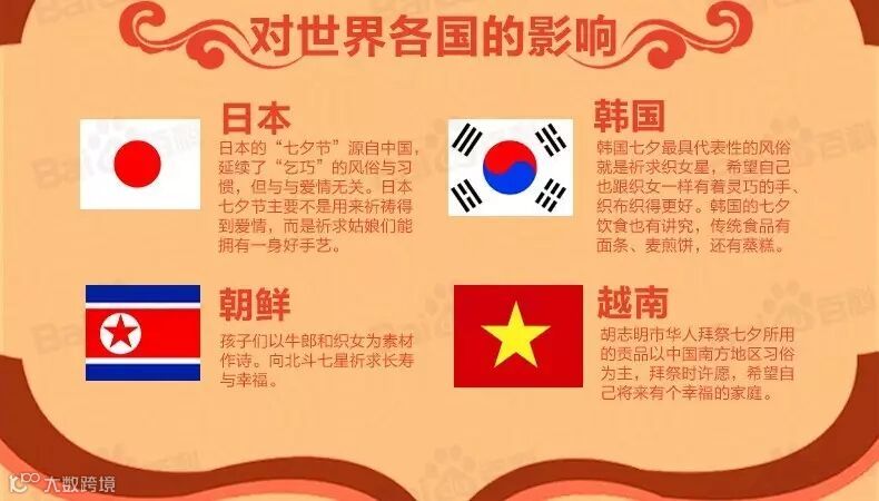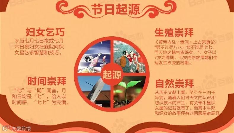 七夕节,又名乞巧节、七巧节或七姐诞,发源于中国,其起源于对自然的崇拜及妇女穿针乞巧,后被赋予了牛郎织女的传说使其成为象征爱情的节日。