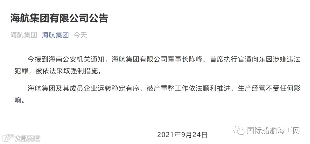 曾收购了最大民营造船厂金海湾造船集团的海航集团董事长陈峰因涉嫌犯罪被采取强制措施。