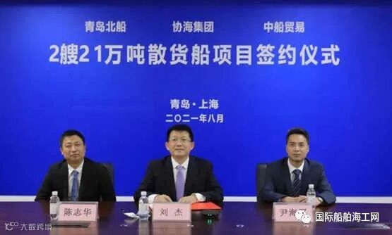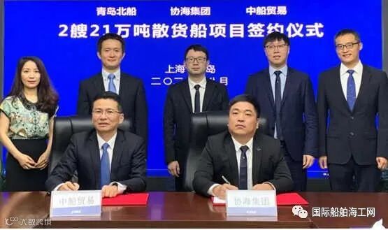 8月16日,中国船舶旗下中船贸易和武船集团北船重工作为联合卖方与浙江协海集团有限公司在上海和青岛两地以“云签约”的方式签署了2艘21万吨散货船建造合同。浙江协海集团董事长王安、北船重工常务副总经理刘杰、中船贸易副总经理吴爱军代表各方在建造合同上签字。