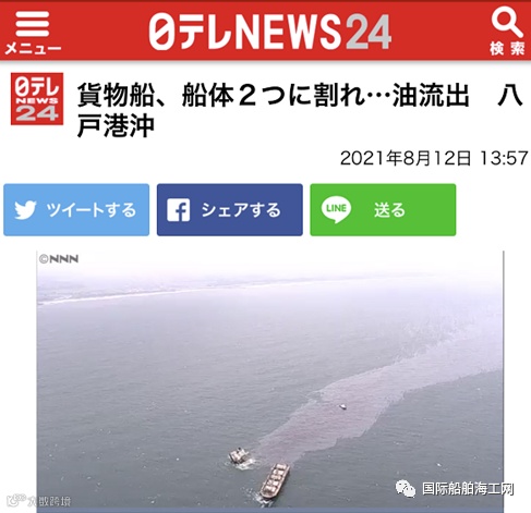 日本电视台:八户港附近海域,货船船体断成两半,出现漏油情况