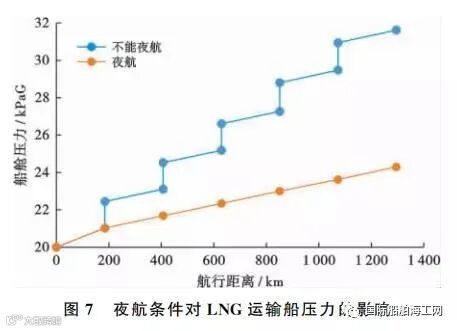 2003—2008年,长江实现了大部分运输船的全线夜航。但由于通航密度、背景灯光等影响,运输船在长江夜航风险要远大于白天,为了防范风险,规定要求老龄油船、载运闪点较低或毒性较大货物的化学品船、散装液化气船应避免在长江夜航。不能夜航使得LNG运输船的进江运输时间大幅延长,同时由于不航行期间BOG消耗量减少导致运输船船舱压力显著升高。以日蒸发率0.2%、舱容30000m3的LNG运输船为例,对比相同运距下能夜航和不能夜航2种运输工况下船舱内压力的升高情况(图7),可以看出,由于不能夜航的限制,导致到达长江上游LNG接收站的LNG运输船饱和压力大幅升高,这是造成卸料过程BOG产生量大的根源。因此,取消内河小型LNG运输船夜航的限制,缩短LNG运输船在长江内运输的停留时间,可从根本上解决内河LNG接收中转站卸船过程产生大量BOG的问题。