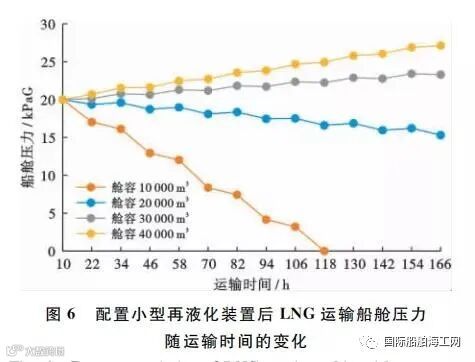 假设小型LNG运输船的日蒸发率为0.2%,为LNG运输船配置0.5t/h处理能力的LNG再液化装置。计算了不同舱容的运输船船舱压力与航行时间的变化,如图6所示。可以看出,若再液化装置在航行中全程开启,则舱容20000m3以下运输船BOG再液化和消耗量将大于BOG产生量,随着运输船航行,船舱压力将下降;舱容30000m3以上小型LNG运输船在航行过程中的船舱压力上升速度也大大降低。因此,为航行时间较长的长江中上游接收中转站项目的小型LNG运输船配置LNG再液化装置可有效解决带压小型LNG运输船到站后船舱饱和压力高、卸船过程中BOG量大的问题。