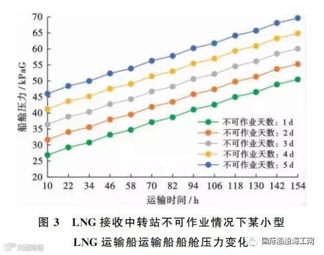 依据《液化天然气码头设计规范》,LNG船舶作业条件标准需要考虑风、雾、波浪、水流等因素影响,长江内河LNG接收中转站同样存在连续几天不可作业的情况。分别计算1~5d不可作业情况下,LNG运输船舱内压力的变化情况(图3),可以看出,随着不可作业天数增加,LNG运输船舱的操作压力迅速上升,每天增加4~5kPa。鉴于不可作业工况下LNG货物的饱和压力明显高于正常运输货物的压力,而出现连续不可作业的概率较低,因此建议内河LNG接收中转站采用降低卸船速度,延长卸船时间的方式接收饱和压力高的LNG,尽量避免接收站设施考虑极端工况而导致配置冗余度过高,造成投资显著增加。