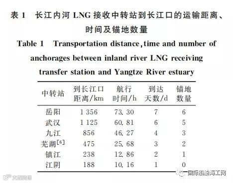 LNG资源沿长江向上游运输过程中,各航段都受到不同航速的限制。其中上海段规定船舶在北槽航道内航速不得超过15节。江苏海事局将水域分为三类:一类桥区水域逆流最高航速不得超过8节,二类通航密集区和交汇区逆流最高航速不得超过9节,三类水域逆流最大航速不得超过12节。另外,根据《长江引航中心船舶夜航安全管理规定》,LNG运输船不能夜航。因此,LNG运输船向长江上游200km以上的LNG中转站运输LNG时,需在长江内寻找合适的应急锚地,作为夜间LNG运输船的停舶水域,并且接收中转站离长江口的距离越远,需要的锚地数量越多。长江内河主要LNG接收中转站的航行距离、时间及锚地数量见表1。