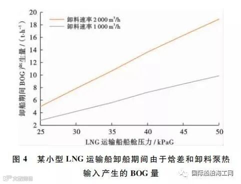 LNG运输船到达LNG接收中转站后进行卸料,在卸船期间产生大量的BOG。在卸料过程中应尽量维持储罐操作压力处于较高水平,以减小BOG的蒸发。按陆上混凝土全容储罐的最大操作压力为25kPaG,并留有一定安全余量,设定卸船过程储罐的操作压力为23kPaG。按LNG接收中转站配置2台200mmLNG卸料臂、1台BOG回气臂,计算卸料过程中由于船舱内LNG饱和压力高和卸料泵热量输入造成的BOG产生量如图4所示。