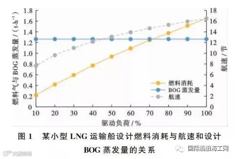 小型LNG运输船适合采用双燃料动力,环保且能有效消耗运输过程中产生的BOG。通常船舶航行速度越高,所需驱动负荷越大,消耗的BOG气体就越多。以某小型LNG运输船为例,其设计燃料消耗与航速和设计BOG蒸发量的关系如图1所示。