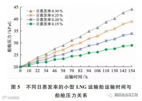 以舱容为30000m3小型LNG运输船为例,计算了不同日蒸发率的小型LNG运输船在内河航行过程中船舱压力的变化(图5)。可以看出,降低小型LNG运输船的日蒸发率可有效减少运输过程中BOG的产生,进而减小运输船到岸时LNG的船舱压力。