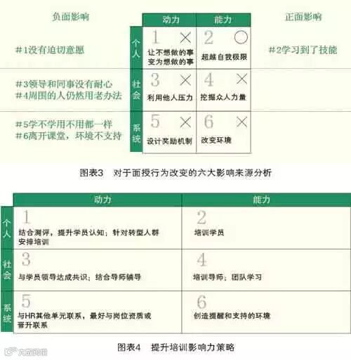 我们不妨以面授培训为例。通过面授课程,我们希望学员产生的关键行为是参与培训,并且把学习到的方法应用于工作(见图表2)。对于影响者模型中影响力六大来源矩阵中的每个来源,我们可以逐个分析到底哪些是正面影响,哪些是负面影响。