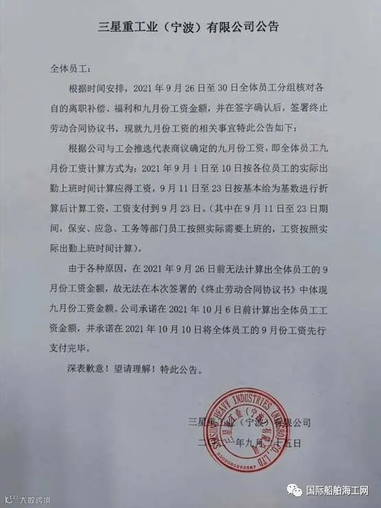 9月25日,对关闭船厂补偿事项,韩国在宁波船厂三星重工业(宁波)有限公司通过官微发布如下公告: