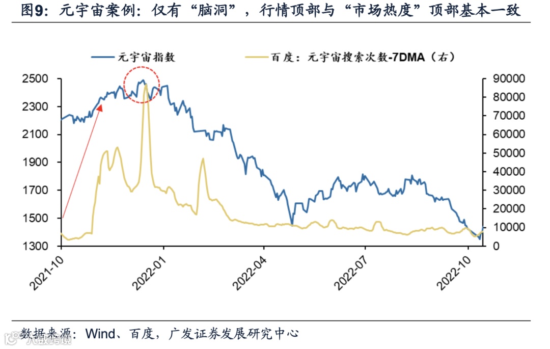 ● 高 Vega 资产看市场空间,与市场传播热度相关:21Q4 元宇宙最终产业未放量,但彼时场景预期高,“脑洞”属性强,搜索热度指数能很好对应行情。