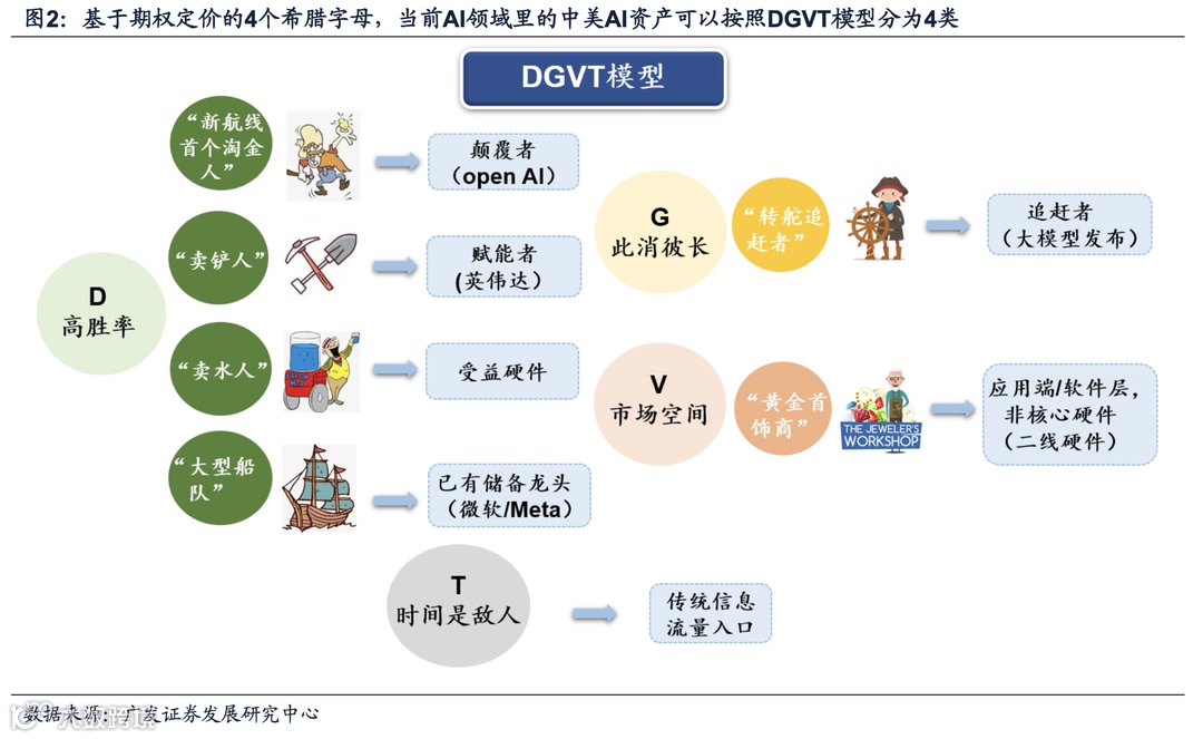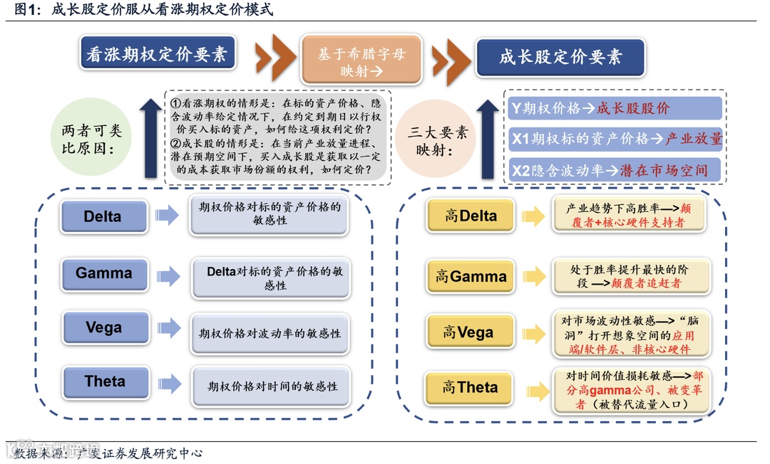 我们提出,当颠覆者诞生催生成长机遇,产业内资产符合看涨期权定价——4个希腊字母(DGVT)对应不同特征资产。