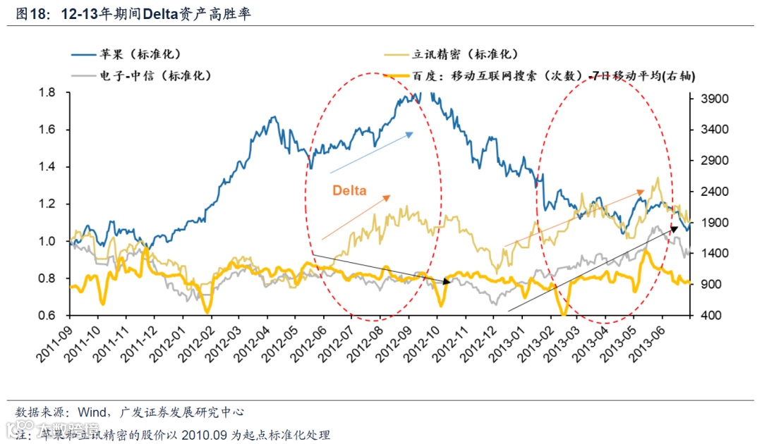 12年年初前后iPhone 4S发布后移动互联网热度升高后回落,虽Vega应用/非核心硬件走弱,但基于中美映射下的Delta资产胜率高,比如立讯精密。