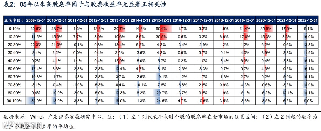 2009年以来,高股息率因子有效性不高。从年度来看,09年以来高股息率因子大多时候并不显著,即股票收益率与股息率的高低没有显著的正相关性。09-22年总共14年间,仅有17、18两个年份高股息率因子比较显著的有效,占比仅有14.3%。